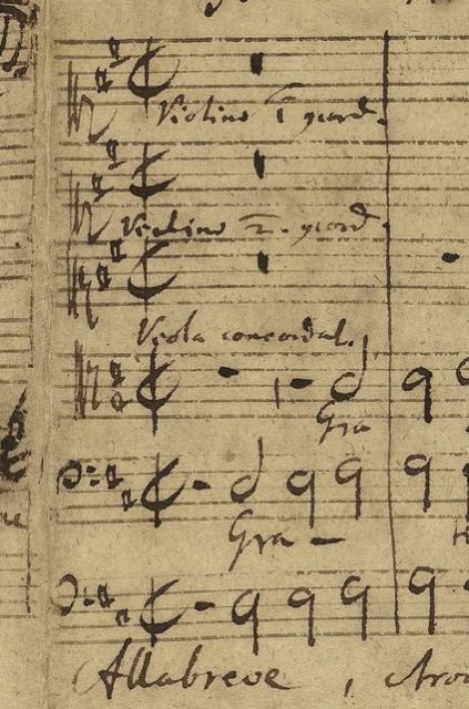 A remark by Barney Sherman (www.bsherman.net/bachtempo.htm) sets off another train of thought. Barney was discussing the modern fad for what could be called 'HIPster' ('Bullivantine' in Sheffield) warp speeds for performances, a subject that doesn't concern us here. Time signatures are thought to indicate baroque composers' intentions with respect to speed. Barney noted that, whereas the B minor Mass has 'C' as time signature (common 4/4 time), the original 1724 version has the alla breve indication(common time 'C' with a vertical line). This can mean either 4/2 or 2/2 (compare for example the B major and E major fugues of Book II of the 48). We note that the early versions of the second Kyrie and the Gratias Agimus Tibi, BWV 232(I), are alla breve but barred in 4/2 time. Short vertical lines are added half way through some of these long bars to guide the reader, as shown below for the early version of the Gratias. |  |