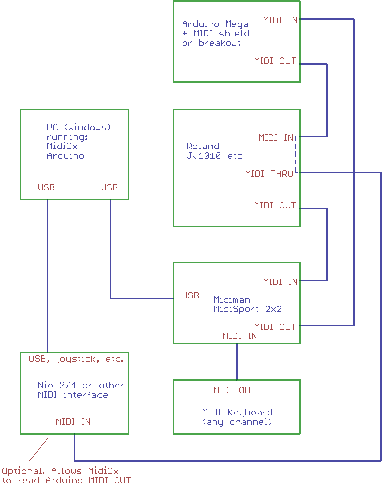 |  How to use midiTemperament | Connect up the Arduino, MIDI-box(es), keyboard and computer as shown in the diagram below. The keyboard can be on any channel.