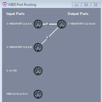|  Midi-OX settings |  | Here's a screenshot of MIDI-OX connections with the MidiSport and Nio boxes connected. You can have as many inputs as you want, but only one output. The MIDI-OX event port may or may not appear, depending on your settings.
