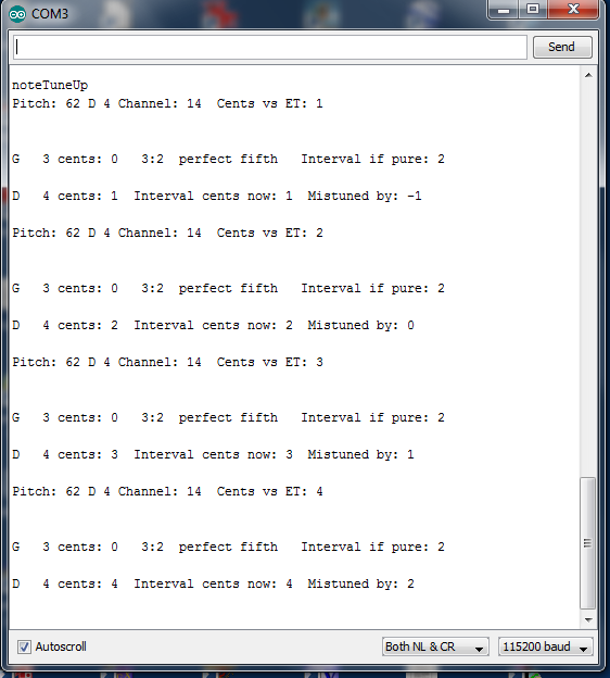 Since the LCD display is too small for present purposes I've sent nearly all the readouts to the serial terminal provided with Arduino. The rotary encoder and the screen let you change channels and display the last note played. The terminal doesn't allow you to store data except by screen copy (below). Other serial software terminals can be used, but future developments will probably use the Processing application as described in the Arduino documentation. Here's a screen copy of the Arduino terminal taken while note D4 was being tuned by comparison with the G below it: